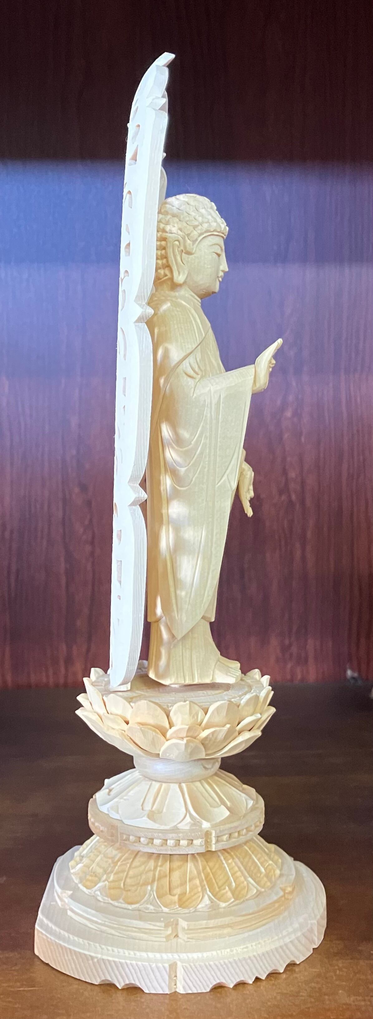 浄土宗、時宗の御本尊です。仏像ではポピュラーな桧材を使用した品です。小型仏壇にご利用されてます。