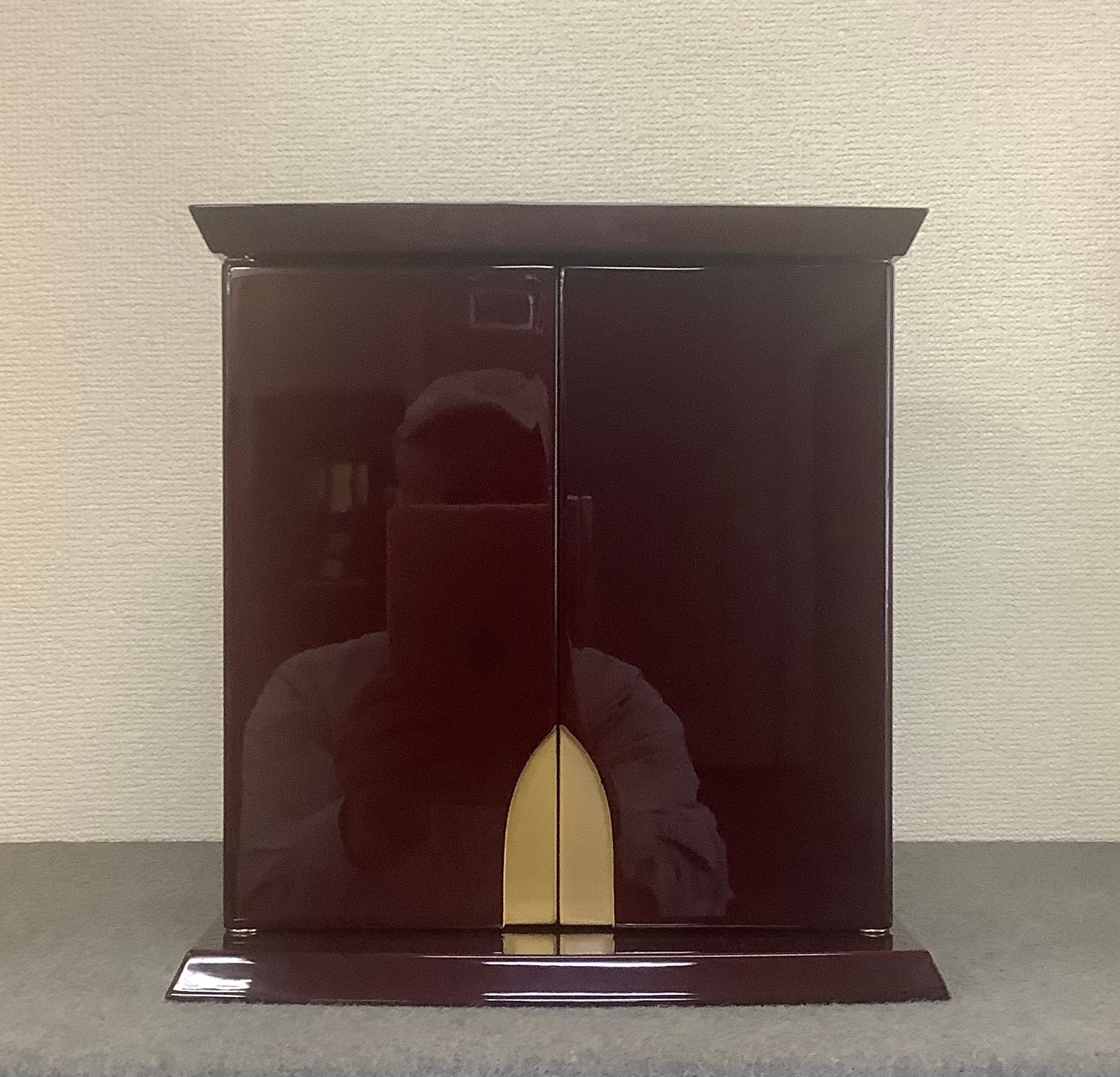 お厨子型のミニ仏壇です。漆塗りワイン色仕上げが美しい国産品です。