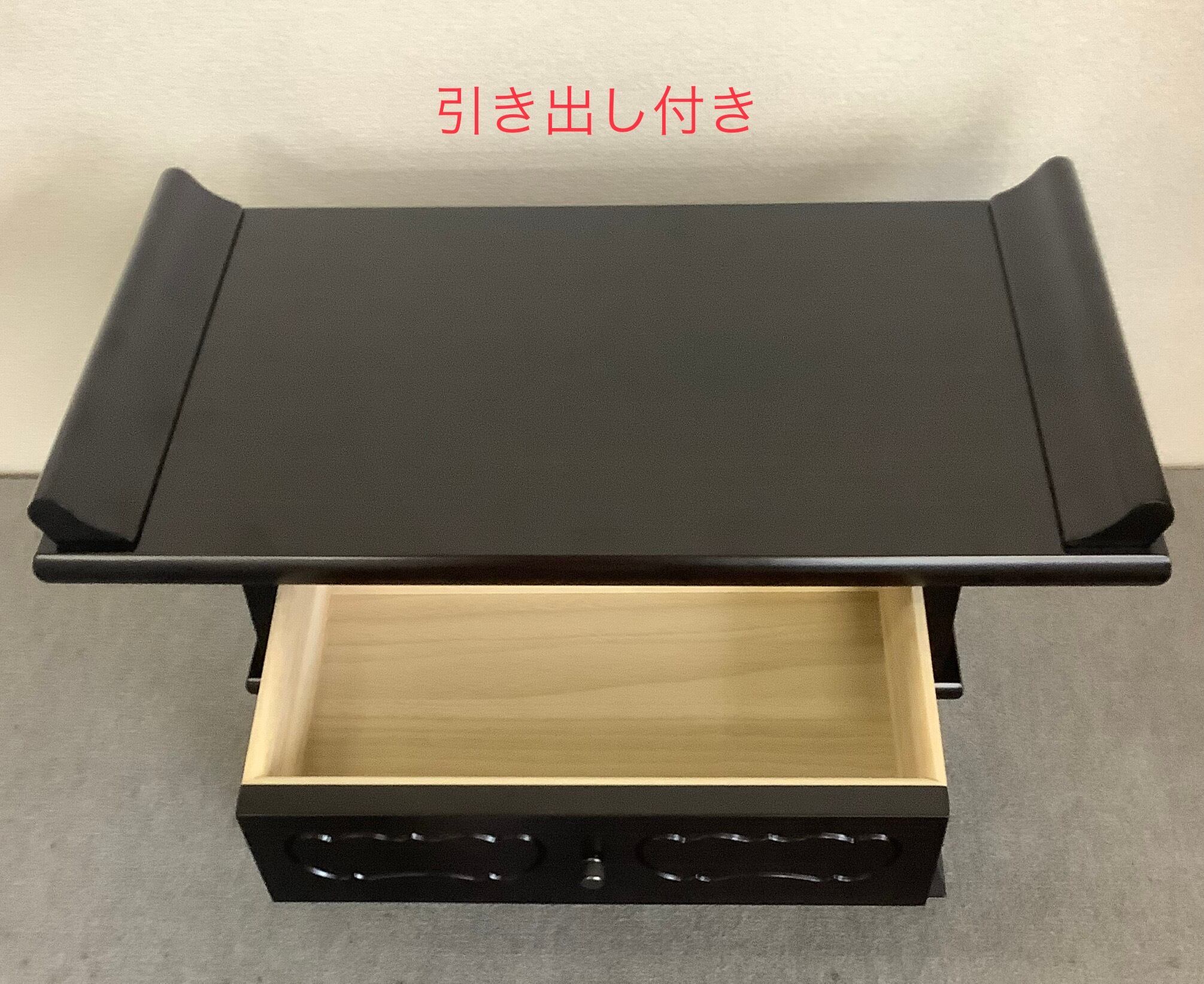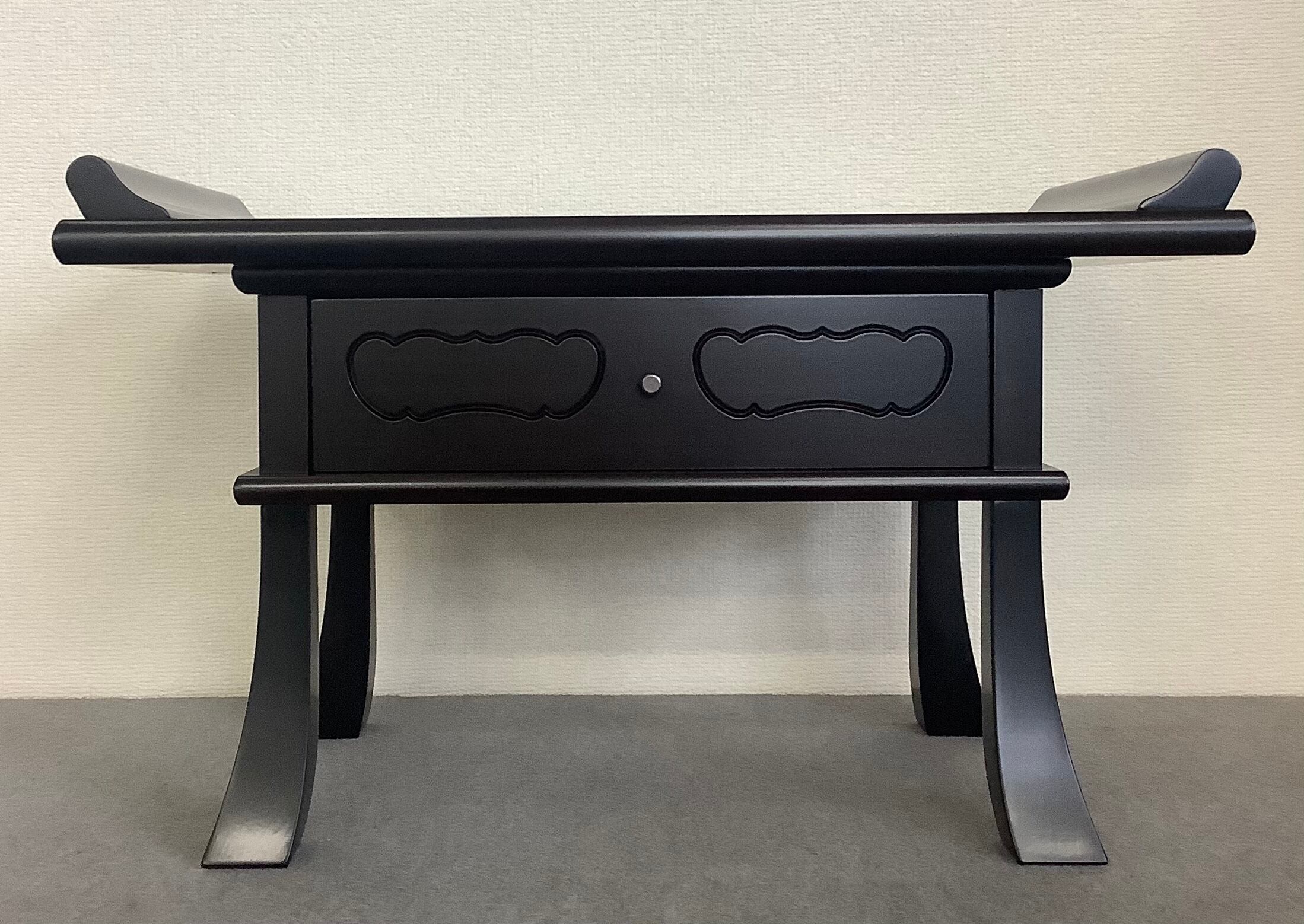 引き出し付きの伝統型経机です。落ち着いた色合いの黒檀調仕上げになっています。